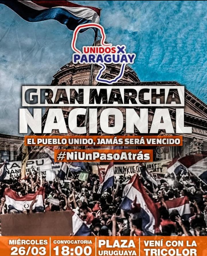 La capital del país vuelve a ser escenario de movilización ciudadana este miércoles 26 de marzo, con la segunda jornada de protestas convocadas por sectores de la oposición y organizaciones sociales en contra de las políticas del gobierno de Santiago Peña. La actividad se desarrollará desde las 18:00 en la Plaza Uruguaya, en Asunción, bajo la consigna “La Gran Marcha Nacional, Unidos por el Paraguay”.