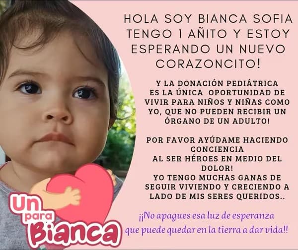 En medio de una situación desesperada, la familia de Bianca, una pequeña que acaba de cumplir dos años el pasado 24 de marzo, ha lanzado una intensa campaña de concientización sobre la donación de órganos bajo el lema “Un corazón para Bianca”. La iniciativa, que ya circula ampliamente en redes sociales, busca encontrar un donante compatible que pueda salvar la vida de la menor, quien se encuentra internada a la espera de un trasplante de corazón urgente.
