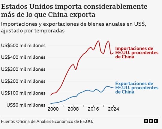 En 2024, el intercambio comercial entre ambas naciones alcanzó los USD 585.000 millones, con un claro desequilibrio que favorece a China. Estados Unidos importó productos chinos por valor de USD 440.000 millones, mientras que las exportaciones estadounidenses a China sumaron apenas USD 145.000 millones, generando un déficit comercial de USD 295.000 millones. Aunque esta cifra es considerable, se encuentra muy por debajo del billón de dólares que Trump ha mencionado repetidamente en sus declaraciones recientes.