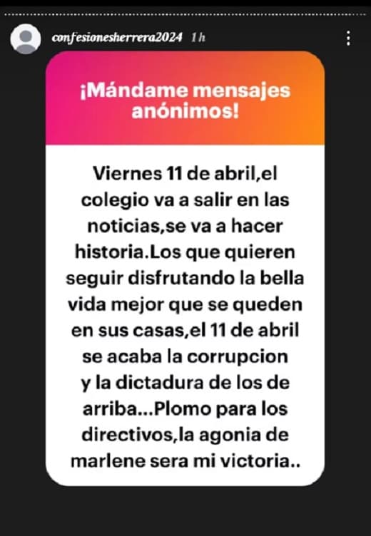 El mensaje difundido por redes sociales contenía advertencias explícitas: “Viernes 11 de abril, el colegio va a salir en las noticias, se va a hacer historia. Los que quieren seguir disfrutando la bella vida mejor que se queden en sus casas, el 11 de abril se acaba la corrupción y la dictadura de los de arriba… Plomo para los directivos, la agonía de Marlene será mi victoria”. La amenaza fue publicada como mensaje anónimo en las “historias” de Instagram, lo que dificulta la identificación inmediata del autor.