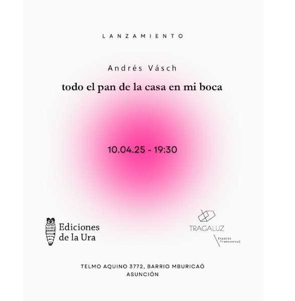 Hoy jueves 10 de abril a las 19:30 horas, el espacio Tragaluz/Espacio Transversal (Telmo Aquino 3772, esquina Flores Cantero, barrio Mburicao, Asunción) será sede del lanzamiento de Todo el pan de la casa en mi boca, el nuevo libro de poemas de Andrés Vásch, editado por Ediciones de la Ura.
