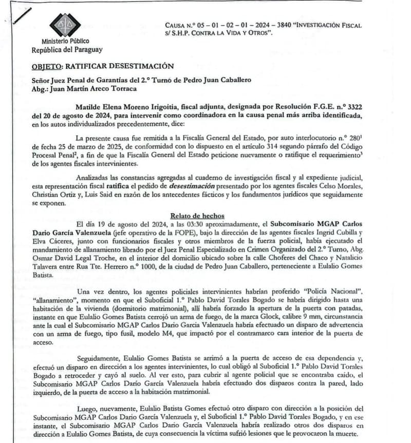 El juez penal de Garantías de Pedro Juan Caballero, Juan Martín Areco Torraca, se había opuesto inicialmente a la solicitud de desestimación, devolviendo el expediente a los fiscales para que reconsideraran su posición. Cuando estos ratificaron su petición el 19 de marzo, el magistrado insistió en su oposición y elevó el caso a la Fiscalía General del Estado para revisión, conforme establece el artículo 314 del Código Procesal Penal.