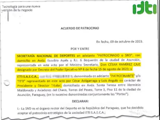 La Secretaría Nacional de Deportes concedió beneficios exclusivos a ITTI Saeca mediante un acuerdo de patrocinio rubricado el 9 de octubre de 2023, apenas dos meses después de la asunción presidencial. El convenio, que estará vigente durante todo el mandato presidencial, establece condiciones especiales para empresas del grupo empresarial ueno Holding, donde Santiago Peña mantuvo participación accionaria hasta recientemente.