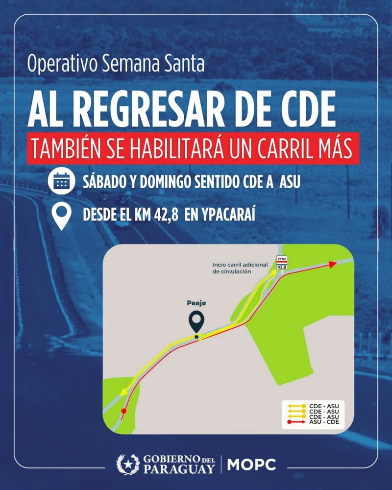 El Ministerio de Obras Públicas y Comunicaciones (MOPC) habilitó un carril adicional en la ruta PY02, a la altura del kilómetro 42,8 en Ypacaraí, para facilitar el retorno de viajeros hacia Asunción durante el fin de Semana Santa. La medida fue implementada como parte del Operativo Retorno dispuesto por la institución estatal.