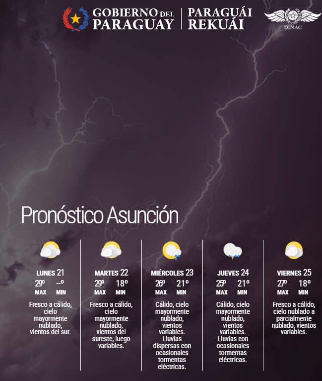 La Dirección de Meteorología e Hidrología anunció que este lunes 21 de abril se presenta con un ambiente que oscila entre fresco y cálido en gran parte del territorio nacional. Las temperaturas máximas previstas se sitúan entre los 27 °C y los 30 °C, tanto en la región Oriental como en la Occidental.