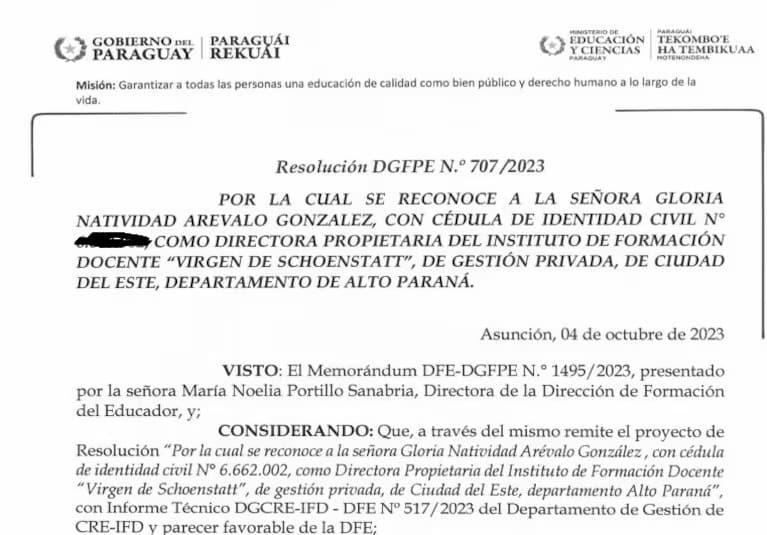 Un tercer instituto investigado, el IFD Virgen de Schoenstatt de Ciudad del Este, está registrado a nombre de Gloria Natividad Arévalo González, hija del matrimonio. La resolución 707 del 4 de octubre de 2023 reconoce a Gloria como directora propietaria, documento tramitado por María Noelia Portillo Sanabria, actual directora de Formación del Educador del MEC y cercana amiga de la familia Arévalo-González.
