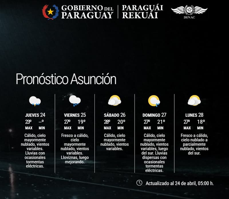 Una jornada con cielo cubierto, lluvias intermitentes y tormentas eléctricas fue anunciada por la Dirección de Meteorología para este jueves. El inicio del día se caracterizó por un ambiente fresco a cálido, con temperaturas mínimas que oscilaron entre los 17 y 22 grados en la mayoría de los departamentos del país.
