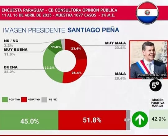 El último informe de CB Consultora OP correspondiente a abril de 2025 sitúa al presidente Santiago Peña en una posición crítica dentro del panorama político sudamericano. Con un índice de aprobación del 45%, el mandatario ocupa el quinto lugar entre sus homólogos de la región, mientras su imagen negativa alcanza un preocupante 51.8%. Esta tendencia negativa se confirma con una caída de 2.1 puntos porcentuales respecto a marzo, evidenciando un deterioro sostenido en la percepción ciudadana sobre su gestión.