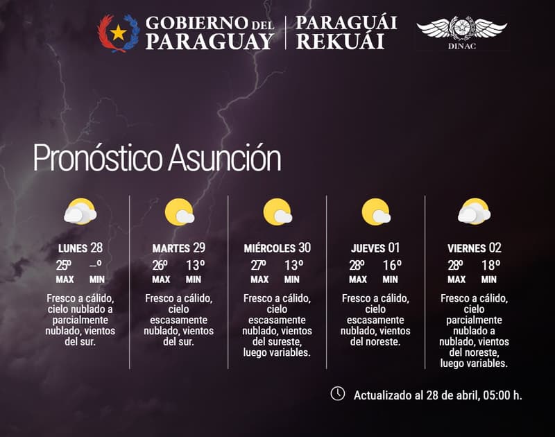 El inicio de semana fue marcado por un amanecer fresco en todo el país, de acuerdo al reporte de la Dirección de Meteorología e Hidrología. Se anticipó que las temperaturas irán en ascenso, alcanzando un ambiente cálido hacia la tarde, con un cielo que se presentará entre nublado y parcialmente despejado.