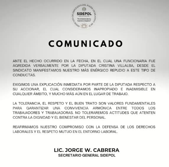 El secretario general del Sindicato de Empleados del Poder Legislativo-Honorable Cámara de Diputados (Sidepol), Jorge Cabrera, desautorizó el comunicado que circuló en medios de prensa repudiando la agresión de la diputada cartista Cristina Villalba hacia una funcionaria legislativa. En declaraciones a ABC Cardinal, Cabrera señaló que el documento difundido no tenía carácter oficial y que solamente se trataba de un borrador que “se filtró” antes de ser aprobado por la asamblea del gremio.