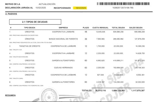 Entre los nuevos pasivos declarados destaca un préstamo de G. 606.986.208 supuestamente adquirido en enero con la Cooperativa Lambaré, precisamente la entidad mencionada en el audio filtrado, además de otro crédito por G. 127.879.259 con el Banco Nacional de Fomento y deudas de tarjetas de crédito por G. 39.980.297.