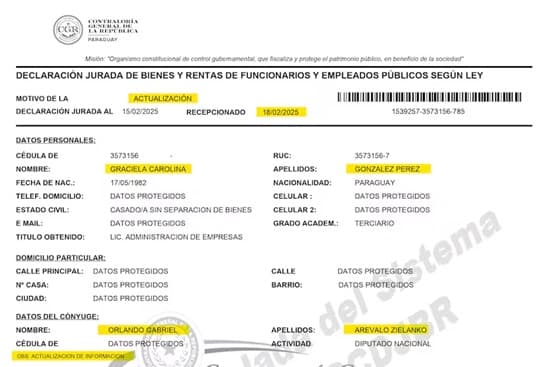 La concejala de Lambaré y precandidata a intendenta, Carolina González, modificó su declaración jurada ante la Contraloría General de la República el pasado 18 de febrero, coincidiendo con la fecha en que la Cámara de Diputados aceptó la renuncia de su esposo, el cartista Orlando Arévalo. Esta actualización incluyó el reporte de millonarios préstamos que aumentaron significativamente su pasivo declarado, en una aparente estrategia para justificar el incremento patrimonial vinculado a la construcción de su residencia en Lambaré.