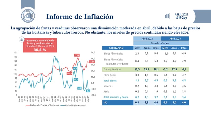 El informe de inflación del Banco Central del Paraguay (BCP) indica que, entre diciembre de 2024 y abril de 2025, el precio de los productos frutihortícolas subió un promedio de 30,8%. El encarecimiento de estos alimentos, esenciales para la dieta diaria, representa una presión directa sobre el gasto de las familias paraguayas.