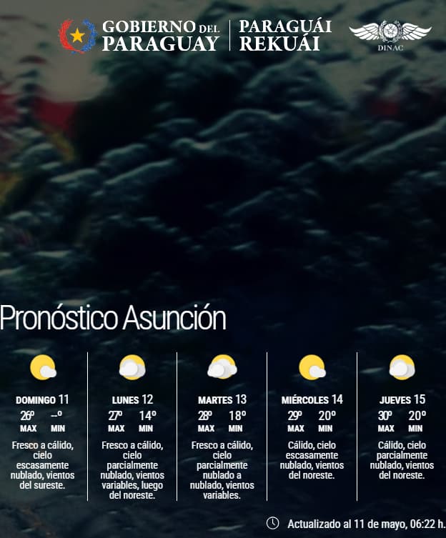La Dirección de Meteorología e Hidrología informó que este domingo 11 de mayo se presenta con condiciones climáticas estables en la mayor parte del territorio nacional.