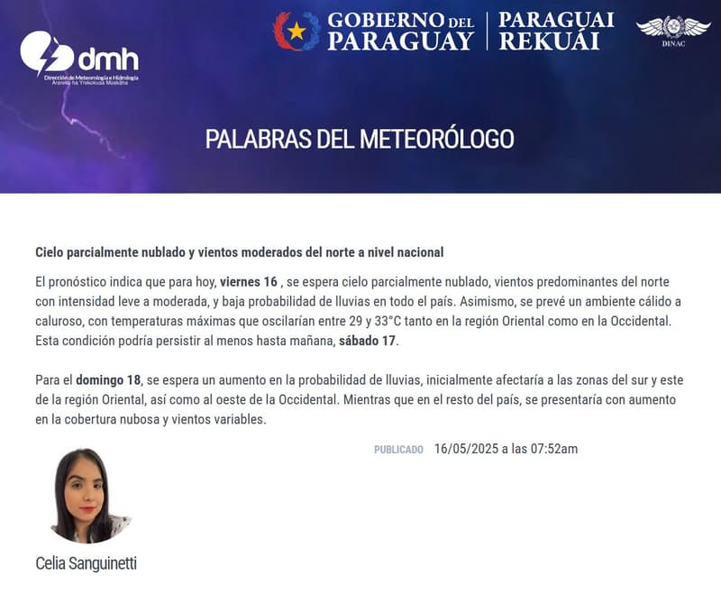 La Dirección de Meteorología e Hidrología anunció que este viernes 16 de mayo se presenta con clima cálido en las primeras horas y caluroso por la tarde, sin probabilidades de lluvias en todo el territorio nacional.