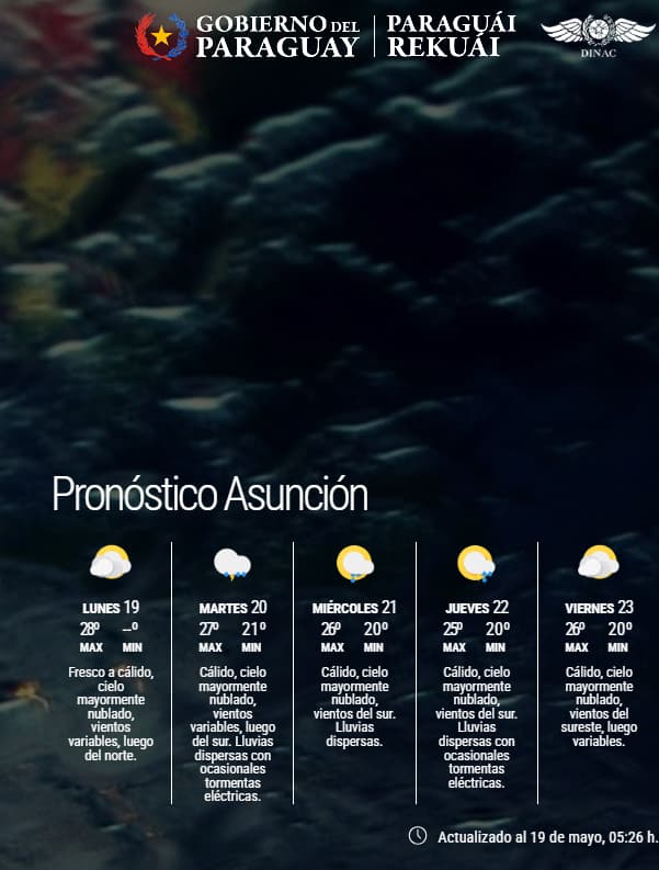 La semana arranca con un amanecer fresco en el país, acompañado de neblinas en distintas zonas del país. Según el pronóstico de la Dirección de Meteorología, este lunes se presenta con cielo mayormente nublado durante las primeras horas, mientras que por la tarde se prevé un ambiente cálido con máximas que podrían alcanzar entre 27 °C y 30 °C, tanto en la región Oriental como en la Occidental.