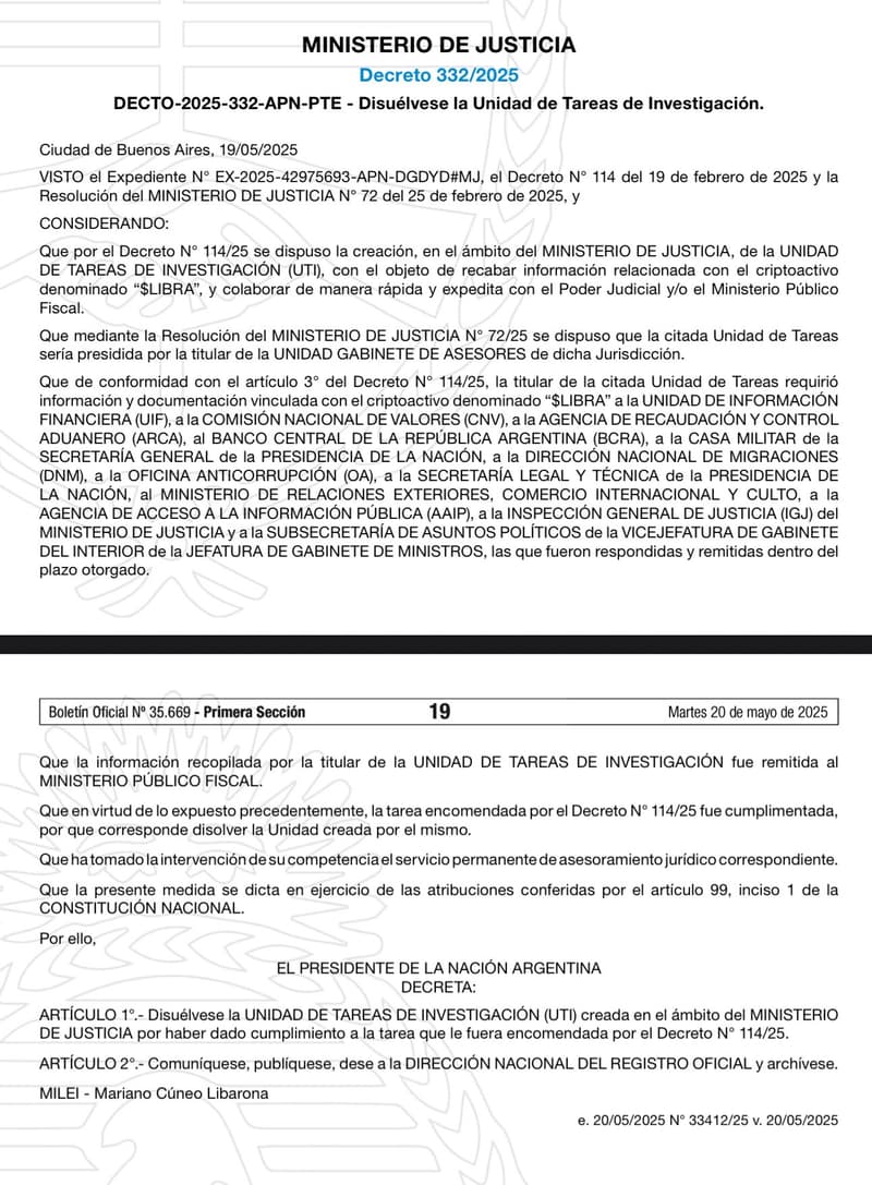 El Gobierno de Javier Milei disolvió la Unidad de Tareas de Investigación (UTI) que había sido creada para recabar información sobre el escándalo en torno a la criptomoneda $LIBRA, promocionada desde las redes oficiales del propio presidente. La medida, oficializada este martes mediante el decreto 332/2025, generó una ola de críticas desde sectores opositores, que ahora impulsan la reactivación de la comisión investigadora en la Cámara de Diputados.