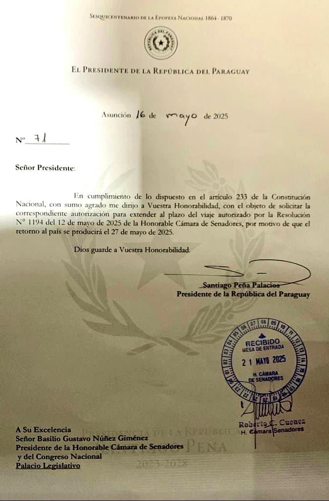 La solicitud del mandatario se refiere a la extensión del permiso concedido por la Cámara de Senadores en la Resolución N.º 1194 del 12 de mayo. En ella, Peña remarca que “el retorno al país se producirá el 27 de mayo”, en lugar del lunes 26, como originalmente se había autorizado.