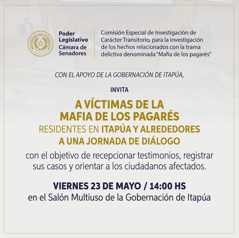 La Comisión de Investigación del Senado se traslada este viernes 23 de mayo al departamento de Itapúa con el objetivo de escuchar a víctimas de la conocida “Mafia de los Pagarés”, en una jornada clave para enfrentar los embargos irregulares que afectan a numerosos ciudadanos.