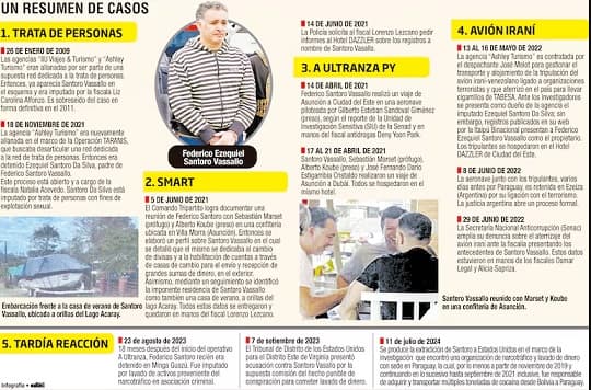La fiscalía local dejó pasar más de un año desde el inicio de la operación A Ultranza Py —en febrero de 2022— para intervenir. Durante ese tiempo, Santoro estuvo vinculado a al menos cuatro investigaciones: trata de personas, operación Smart, A Ultranza Py y el caso del avión iraní-venezolano. Sin embargo, su nombre no motivó acciones judiciales inmediatas.
