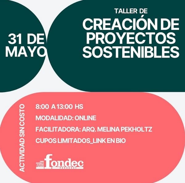 La arquitecta urbanista Melina Pekholtz brindará este sábado 31 de mayo un taller gratuito titulado Creación de Proyectos Sostenibles, dirigido a actores del ámbito cultural y social. La capacitación está orientada a gestores culturales, funcionarios de instituciones de arte y cultura, asociaciones de artesanos, así como investigadores sociales y culturales. Se realizará en modalidad virtual, de 8:00 a 12:00, con participación libre mediante inscripción previa.
