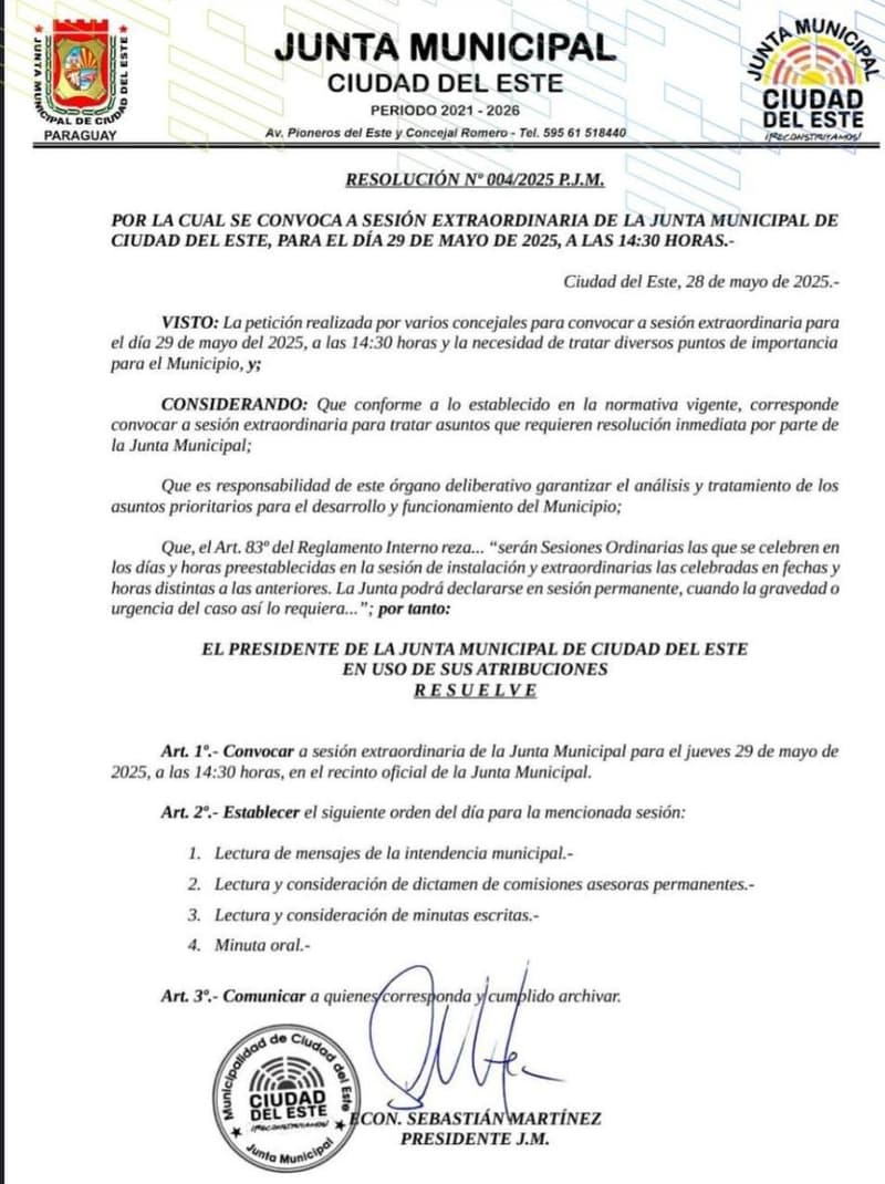 Ciudad del Este vive horas de tensión política. El presidente de la Junta Municipal, Sebastián Martínez, convocó a una sesión extraordinaria para este jueves a las 14:00, en medio de crecientes rumores sobre la posible renuncia del intendente Miguel Prieto Vallejos, líder del movimiento Yo Creo.