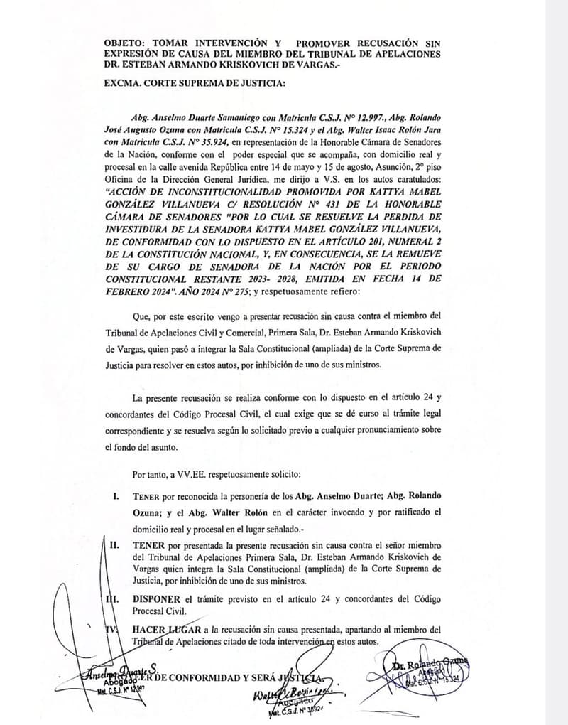 Según Núñez, Ríos fue recusado por haber emitido declaraciones públicas relacionadas al caso y por su pasado como legislador. En cuanto a Kriskovich, no se presentó una causa específica. El escrito fue elaborado por un equipo jurídico contratado por el Senado, supuestamente con el respaldo de los 23 senadores que votaron por la salida de González.