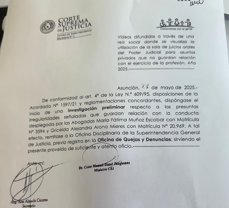 La Corte Suprema de Justicia abrió una investigación preliminar contra las abogadas María Fátima Muñoz Escobar y Gricelda Alejandra Arona Mieres, tras la difusión de videos en redes sociales donde ambas aparecen bailando dentro de salas judiciales.