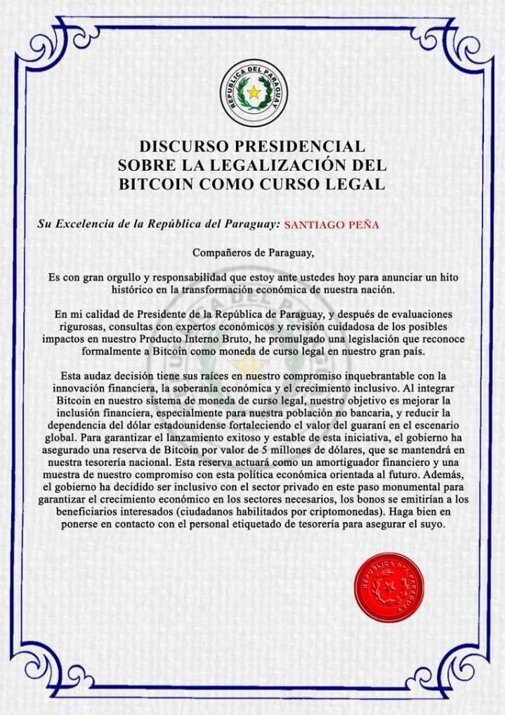 El mensaje, publicado con el estilo institucional habitual, proclamaba una medida económica “histórica”, detallando una supuesta reserva nacional de USD 5 millones en Bitcoin y argumentando que la decisión buscaba reducir la dependencia del dólar estadounidense, además de fortalecer el guaraní. Todo esto, sin respaldo de fuente oficial alguna.