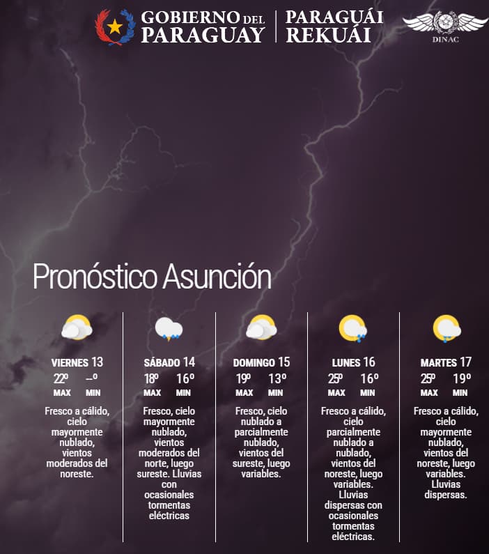 La Dirección de Meteorología prevé para este viernes una jornada marcada por el ascenso térmico, sin presencia de lluvias. El ambiente se presentará inicialmente fresco, con temperaturas mínimas que rondan los 16 °C en varias regiones del país.