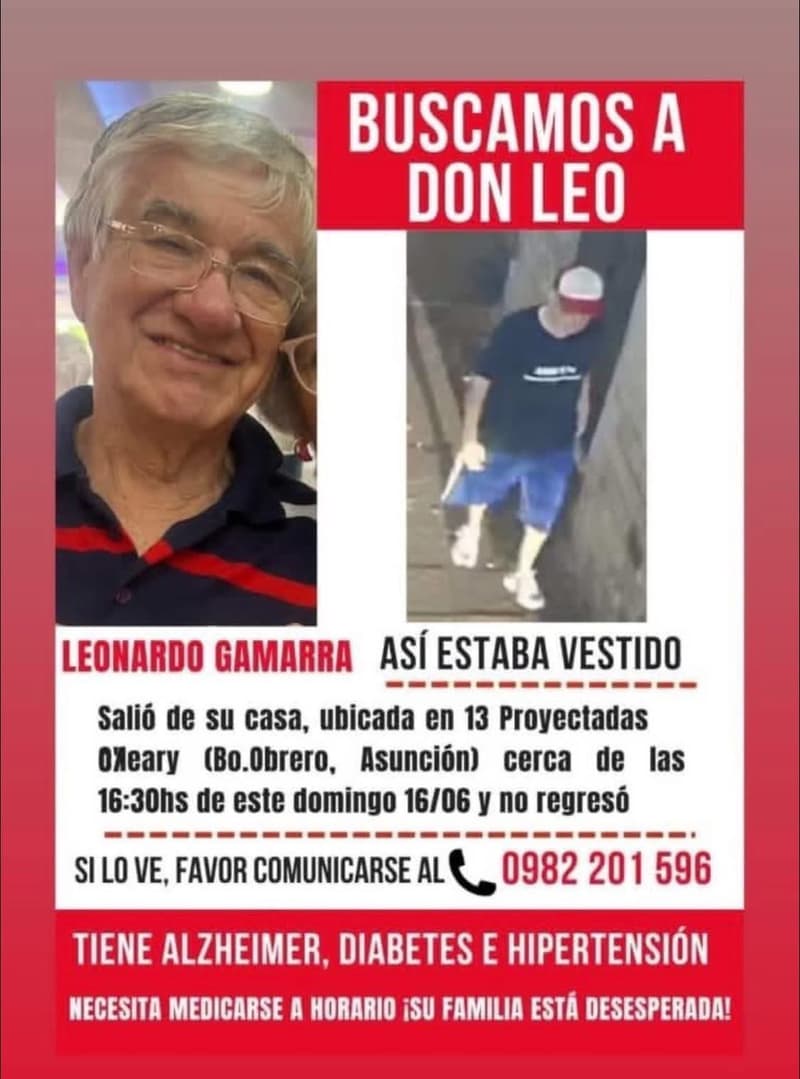 La familia de don Leonardo Gamarra, de 76 años, se encuentra desesperada tras su desaparición del día de ayer en Barrio Obrero. El adulto mayor fue visto por última vez alrededor de las 16:30, cuando salió de su casa ubicada en la intersección de las calles 13 Proyectadas y O’Leary. Desde entonces, no se ha tenido noticias sobre su paradero.