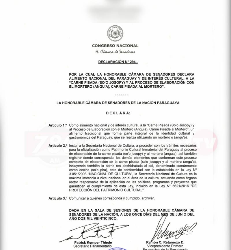 El soyo, típico plato guaraní elaborado tradicionalmente con carne pisada en mortero (angu’a), fue reconocido como parte integral de la cultura popular del país. El documento emitido por el Senado destaca que este proceso ancestral, donde la carne se tritura manualmente, da origen a una de las comidas más representativas del Paraguay.