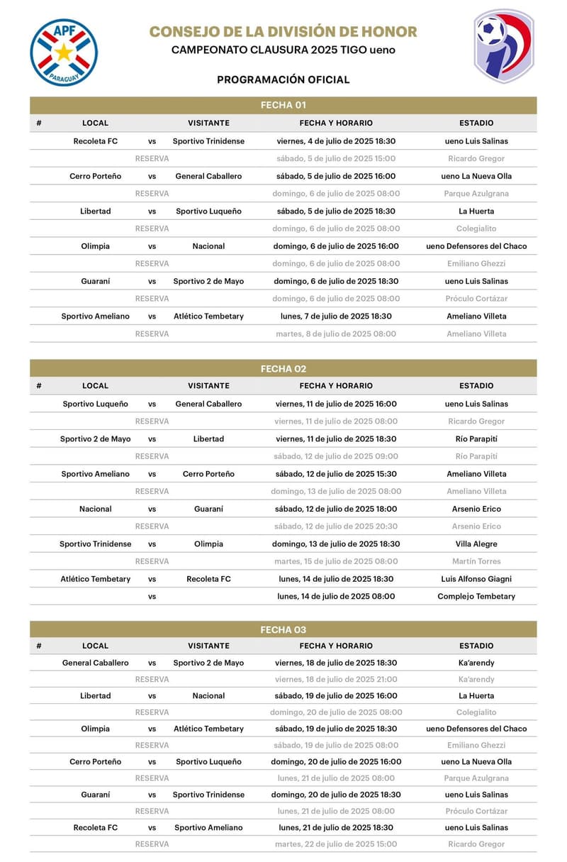 El campeonato Clausura 2025 ya tiene su hoja de ruta inicial. La Asociación Paraguaya de Fútbol (APF), a través del Consejo de la Divisional Profesional, definió la programación de las primeras cinco jornadas del torneo que comenzará el viernes 4 de julio.