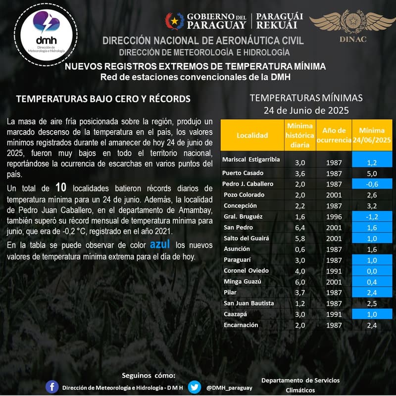 La madrugada del martes 24 de junio fue una de las más frías registradas en los últimos años en el país. Según datos divulgados por la Dirección de Meteorología e Hidrología (DMH), diez localidades del país marcaron nuevos récords diarios de temperatura mínima, mientras que en Pedro Juan Caballero se superó incluso un registro mensual histórico.