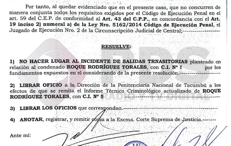 Justicia determinó que Roque Rodríguez González, condenado a 25 años de prisión más una medida de seguridad de 10 años, no accederá al beneficio de salida transitoria. El fallo fue emitido por el juez de Ejecución Penal Víctor Manuel Benítez, quien argumentó que el interno no reúne las condiciones requeridas para este tipo de beneficios.