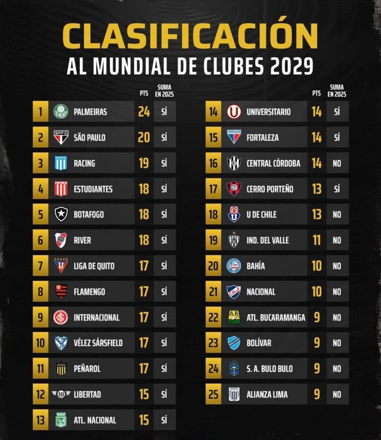 Cabe recordar que para el Mundial de Clubes 2025 —que será una edición especial con 32 equipos— la Conmebol tendrá 6 cupos: los campeones de la Libertadores 2021 a 2024 se clasifican directamente, y los puestos restantes se asignan por ránking, considerando el rendimiento acumulado en esas ediciones. Si un club repite campeonato, se habilita una plaza adicional para el mejor ubicado en el ránking.