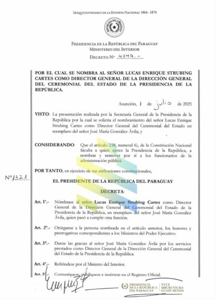 A través del Decreto 4149, firmado el 1 de julio, el presidente oficializó la designación de Lucas Enrique Strubing Cartes como director general del Ceremonial del Estado, un cargo clave en la organización de actos oficiales y la diplomacia institucional.