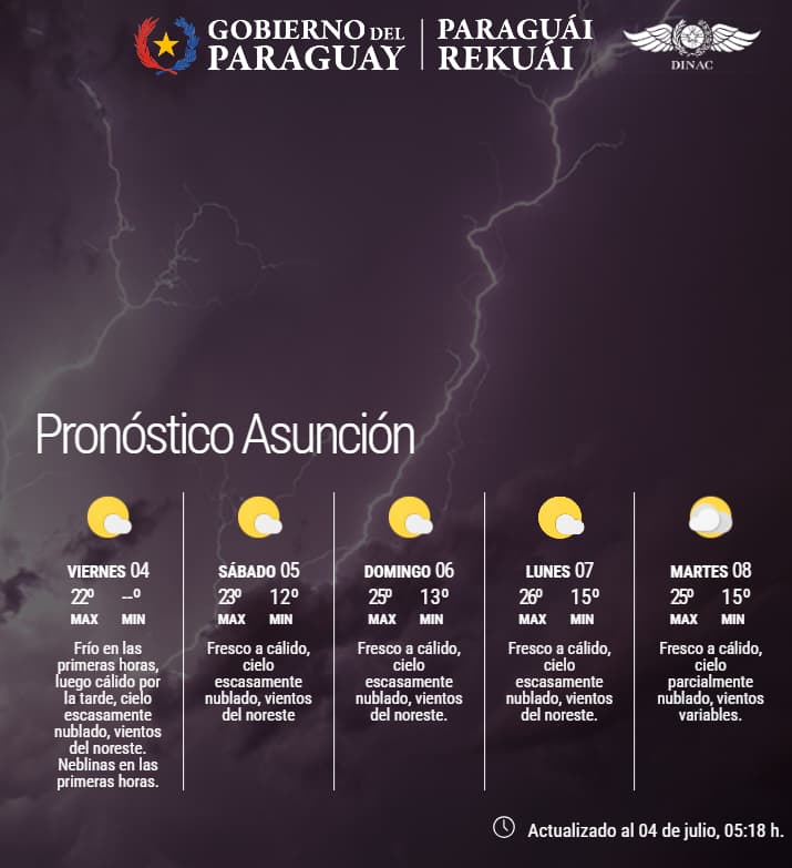 El amanecer de este viernes estará marcado por un ambiente frío a fresco, acompañado de neblinas en distintas zonas del país, según informó la Dirección de Meteorología. Las temperaturas mínimas se ubicarían entre los 8°C y los 17°C, dependiendo de la región.