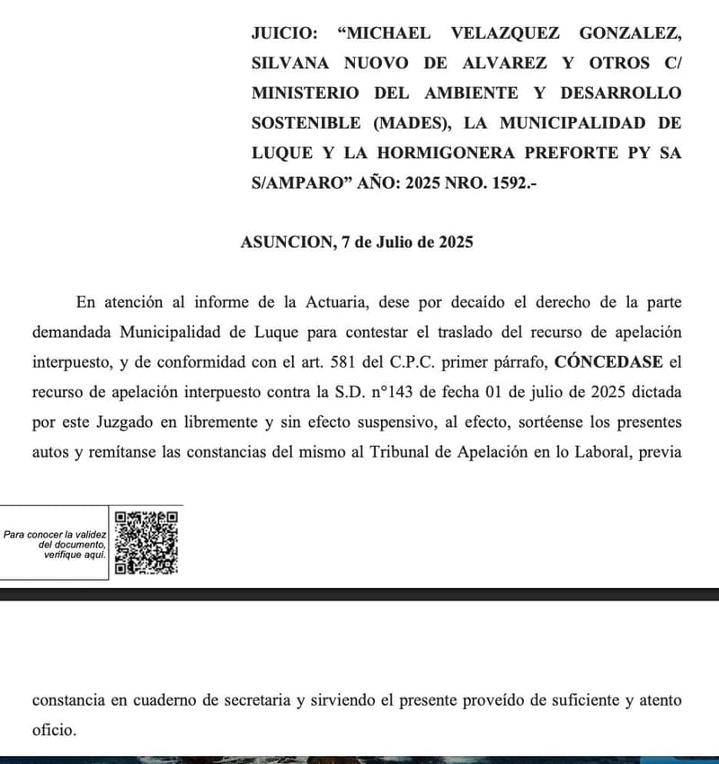 El expediente se inició tras una acción de amparo presentada por residentes de la zona, quienes denunciaron la instalación de la planta hormigonera en un área clasificada como residencial por la Ordenanza Municipal 30/01. La empresa recibió una orden de suspensión por parte de la Intendencia de Luque el 19 de junio de 2025, pero según consta en autos, continúa operando.