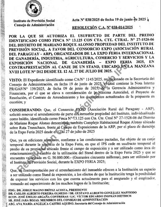 El Consejo de Administración del Instituto de Previsión Social (IPS) aprobó mediante la Resolución C.A. N.º 038-014/2025 el usufructo de parte de su terreno ubicado en Mariano Roque Alonso, a favor del Consorcio Expo, organizador de la Expo Feria Internacional 2025. A cambio, el IPS recibirá un stand dentro del evento para difundir sus servicios al público.