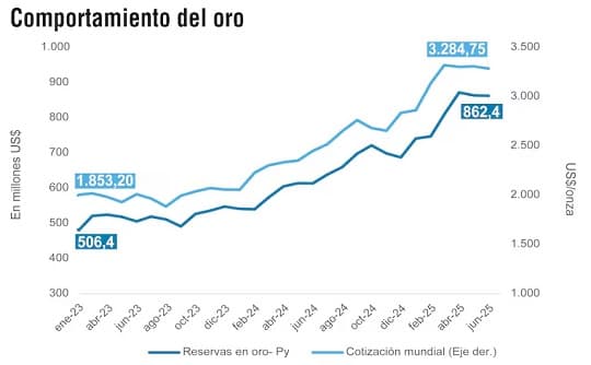 Entre enero de 2023 y junio de 2025, el Banco Central del Paraguay (BCP) obtuvo un crecimiento sustancial en el valor de sus reservas en oro, gracias a la notable apreciación del metal en los mercados internacionales. Sin realizar compras significativas, el valor de la cartera pasó de USD 506,4 millones a USD 862,4 millones, lo que representa una suba del 70,3% en dos años y medio.