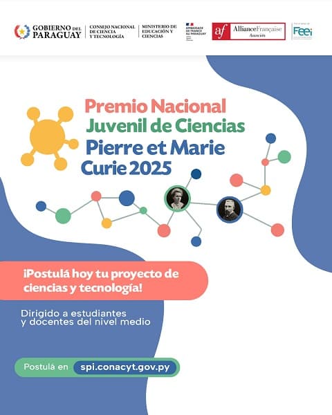 El Premio Nacional Juvenil de Ciencias Pierre et Marie Curie lanzó su convocatoria 2025, dirigida a estudiantes del nivel medio de todo el país. Esta vigésima tercera edición se centrará nuevamente en las categorías de Ciencia y Tecnología, con el objetivo de fomentar el interés por la investigación científica entre jóvenes paraguayos.