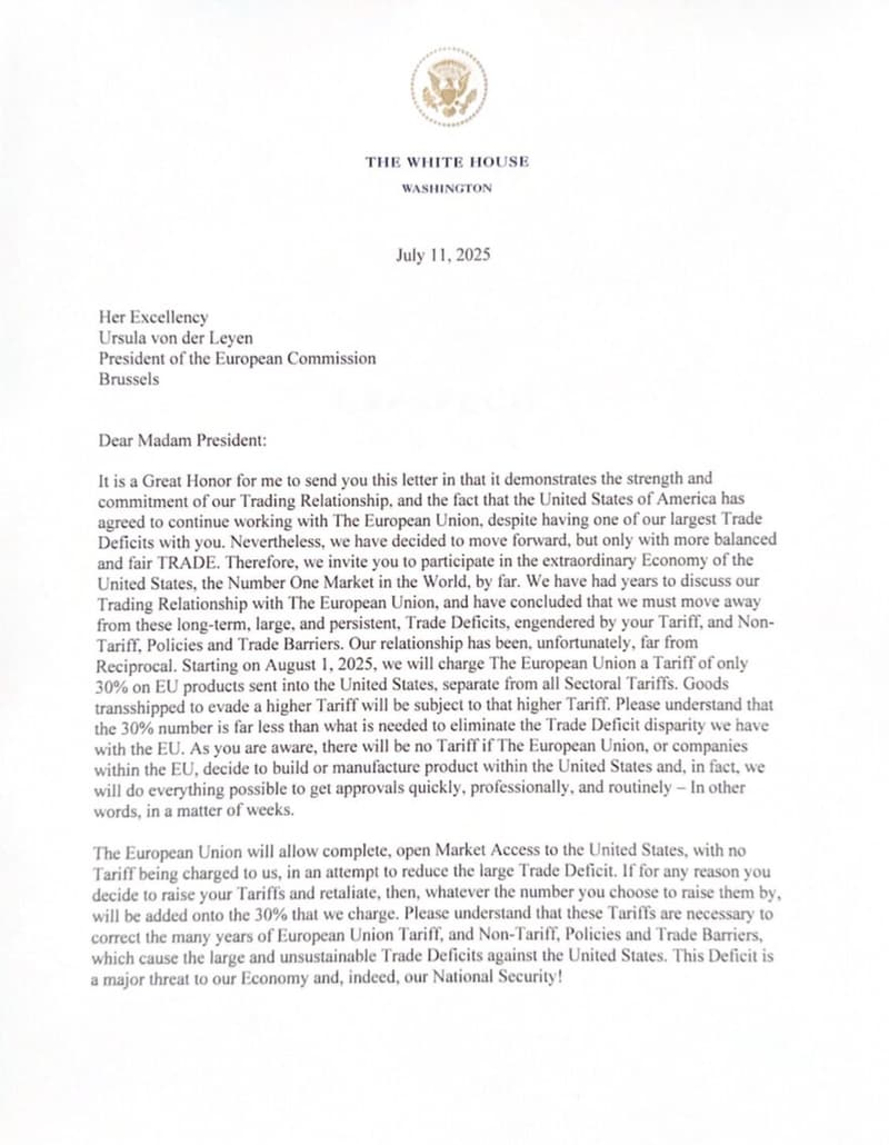 La presidenta de la Comisión Europea, Ursula von der Leyen, criticó duramente la decisión. Afirmó que la medida “alterará las cadenas de suministro transatlánticas” y afectará tanto a consumidores como a empresas en ambas regiones. A pesar de ello, reafirmó la voluntad del bloque europeo de seguir negociando un acuerdo antes del 1 de agosto, sin descartar represalias comerciales.