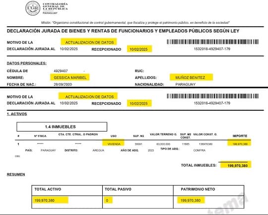 Lo que generó sospechas es que, en su declaración jurada presentada el 10 de febrero de este año, Gessica incluyó una vivienda valorada en G. 199.970.380.