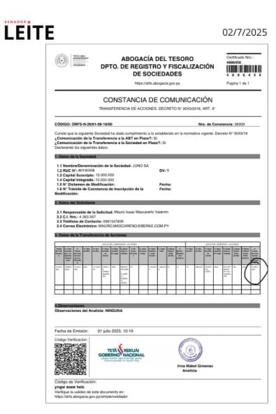 Leite no solo participó de las gestiones iniciales, sino que además fue socio fundador de JUNO S.A., la empresa paraguaya a la que se consignaron 82 equipos industriales valuados en casi USD 84 millones. La maquinaria fue declarada como “líneas de producción biotecnológica”, pero su instalación en la Triple Frontera levanta serias sospechas.