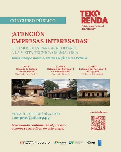 Las obras previstas incluyen la restauración de la Casa de la Cultura de San Pedro, la Estación del Ferrocarril de San Salvador (Guairá) y la Estación del Ferrocarril de Ybytymi (Paraguarí), sitios de valor histórico y simbólico para sus respectivas comunidades.