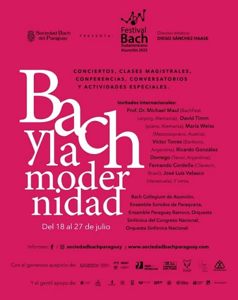 Asunción será sede del Segundo Festival Bach Sudamericano, que se celebrará del 18 al 27 de julio de 2025. Organizado por la Sociedad Bach del Paraguay, el evento fue declarado de Interés Cultural Nacional y cuenta con el apoyo de la Secretaría Nacional de Cultura, los Fondos de Cultura e Ibermúsicas.