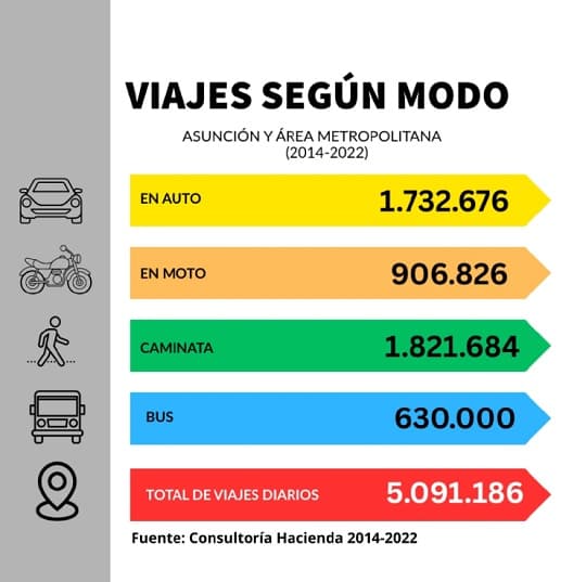 Un estudio del Banco Mundial reveló que solo el 7% de los viajes diarios en la zona se realizan en bus. El resto se divide entre vehículos particulares, motocicletas y caminatas. La media de espera por un colectivo es de casi 21 minutos, y los viajes al trabajo superan los 40 minutos en promedio.