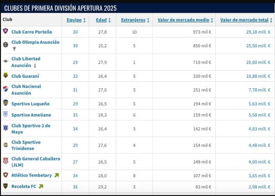 Tras el cierre del mercado de pases y con la puesta en marcha del Torneo Clausura 2025, los principales equipos del fútbol paraguayo hicieron grandes apuestas en materia de fichajes y renovaciones. Las inversiones se reflejan en el valor de mercado de cada plantel, y Cerro Porteño se posiciona actualmente como el club más valioso del país.