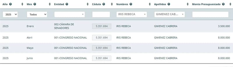 Ambos ingresaron como contratados en agosto de 2023, y fueron ascendidos en 2025 a funcionarios nombrados, triplicando sus salarios. Iván pasó de ganar G. 3.500.000 a G. 13.500.000, mientras que Iris llegó a G. 8.000.000. Todo esto bajo la supervisión de su tía, quien presidía la comisión mencionada.